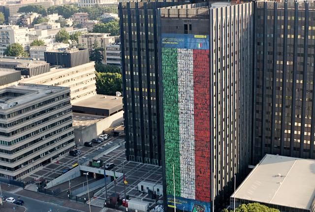 Poste Italiane, realizzato un tricolore di 60 metri per tifare gli AzzurriGiovedì, 10 giugno 2021La maxi-bandiera è stata realizzata con le foto di 1200 dipendenti di Poste ed esposta nella sede centrale di Roma per sostenere la Nazionale di calcio