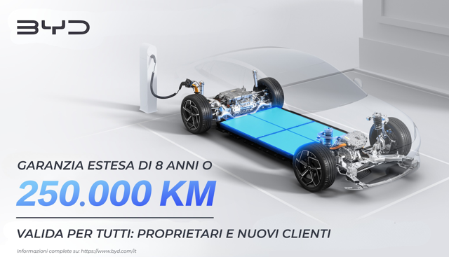BYD rafforza la fiducia sull’elettrico: Blade Battery garantita fino a 250.000 kmLunedì, 19 gennaio 2026BYD innalza gli standard del settore elettrico: garanzia estesa a 250.000 km sulle Blade Battery, con SOH minimo del 70%, valida anche per chi già guida BYD.