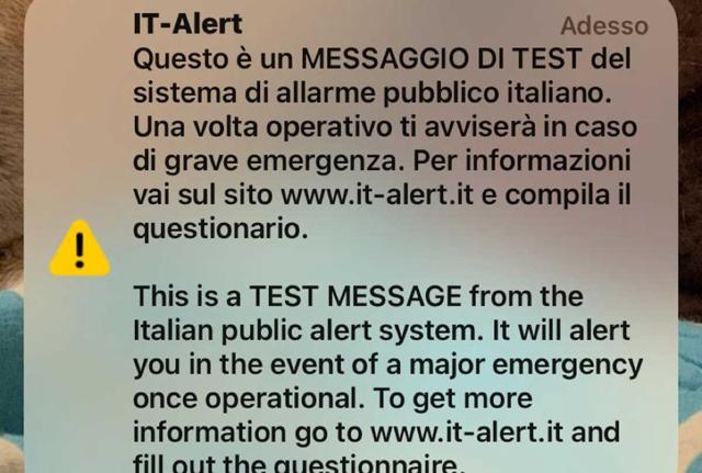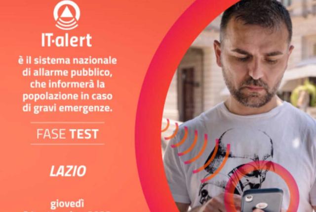 21 settembre: su Roma e il Lazio 5,8 mln di sms. It-Alert, prove tecnicheLunedì, 11 settembre 2023Il prossimo 21 settembre primo test operativo per It-Alert, il sistema unico nazionale di allerta per la popolazione. Alle 12, 5,8 mln di sms