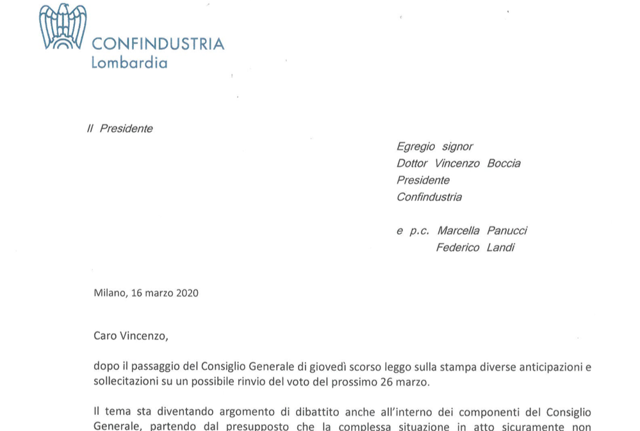 Confindustria Lombardia scrive a Boccia:no rinvio dell'elezione del presidenteLunedì, 16 marzo 2020Esclusivo, lettera di Bonometti a Viale dell'Astronomia mentre circolano i rumors su volontà di rinvio del voto di designazione