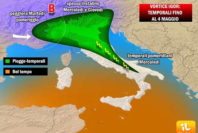 Previsioni meteo, il vortice Igor non molla: temporali e nevicate. La mappaMartedì, 2 maggio 2017Pazza primavera: vortice Igor sull’Italia almeno fino al 4 maggio