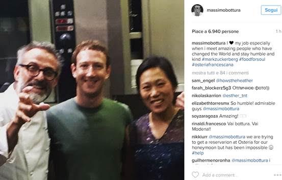 Lo chef Massimo Bottura incontra Zuckerberg: le foto sui socialLunedì, 29 agosto 2016Zuckerberg e la moglie, dopo una gita sotto la Ghirlandina, hanno fatto tappa all'Osteria Francescana di Massimo Bottura