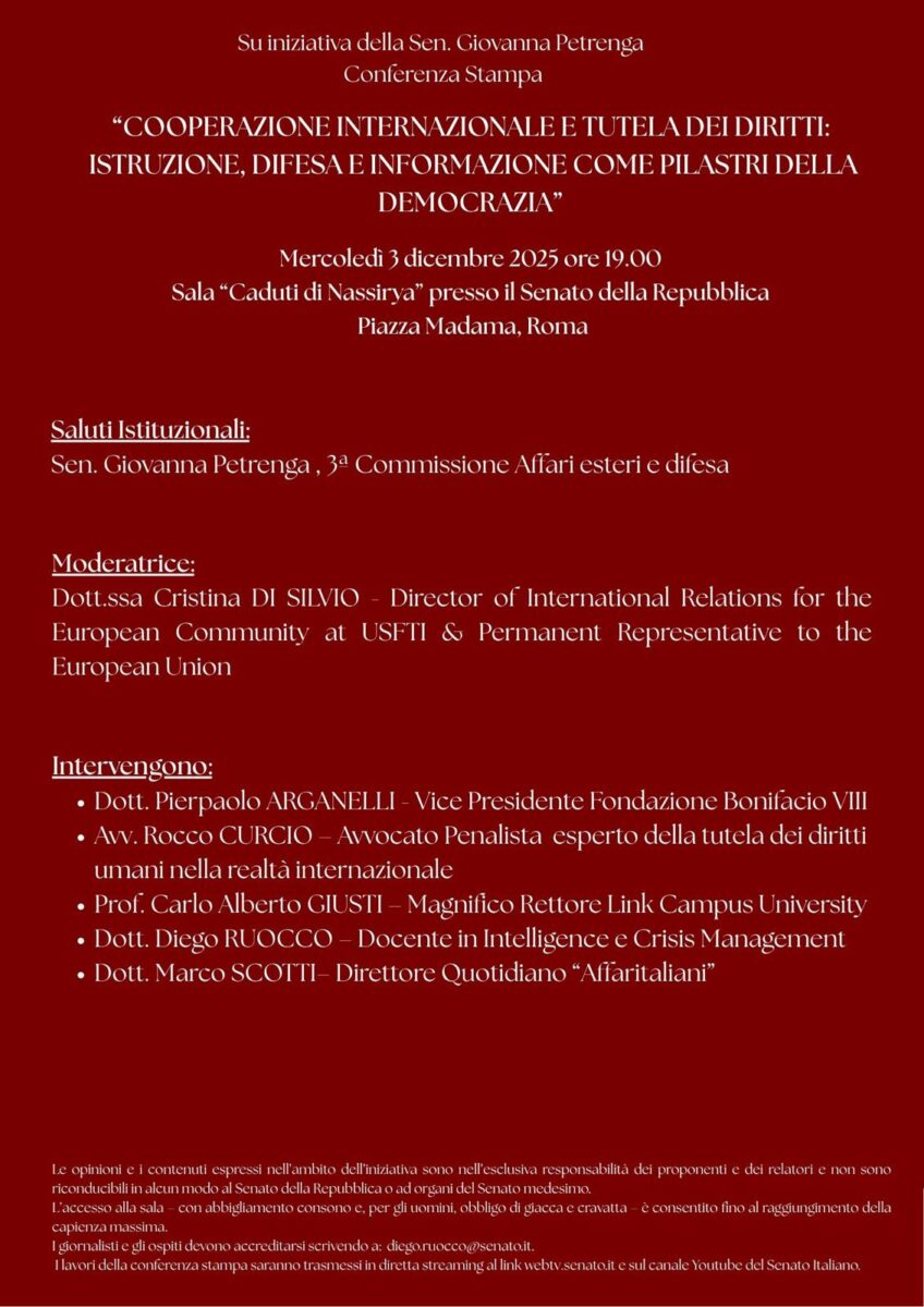 L’appuntamento è fissato per mercoledì 3 dicembre alle ore 19, presso la Sala Caduti di Nassirya del Senato della Repubblica.