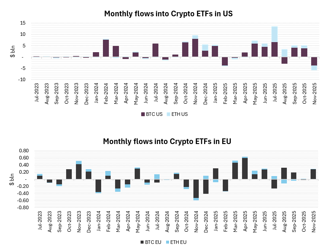 Come previsto, i flussi sono stati contenuti: negli Stati Uniti, sia Bitcoin sia Ethereum hanno registrato il primo mese di deflussi da febbraio, con Ethereum che ha segnato il peggior mese della sua storia sul mercato statunitense, confermando la maggiore ciclicità e volatilità degli altcoin rispetto a Bitcoin. In Europa il contesto si è mostrato più resiliente, con gli ETF su Bitcoin che hanno registrato flussi in ingresso, evidenziando tra gli investitori europei un approccio orientato al “buy the dip”.