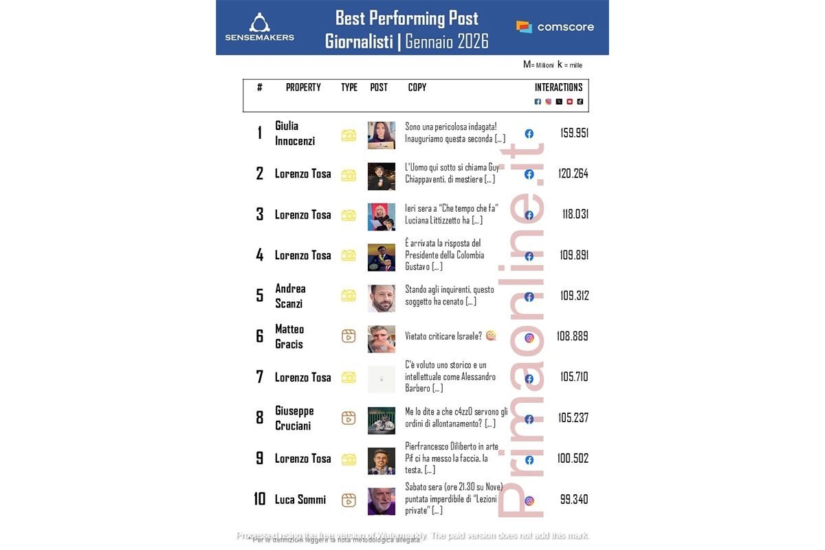 Segnale positivo anche per Roberto Saviano, nono con 636 mila interazioni e 8,0 milioni di video views: la crescita è legata soprattutto alle visualizzazioni (+56%), grazie a un video sull’attacco americano in Venezuela, pubblicato in modo trasversale su Instagram, TikTok e Facebook. Secondo l’analisi, quel contenuto vale circa il 30% delle interazioni del mese e oltre il 40% delle video views complessive.
