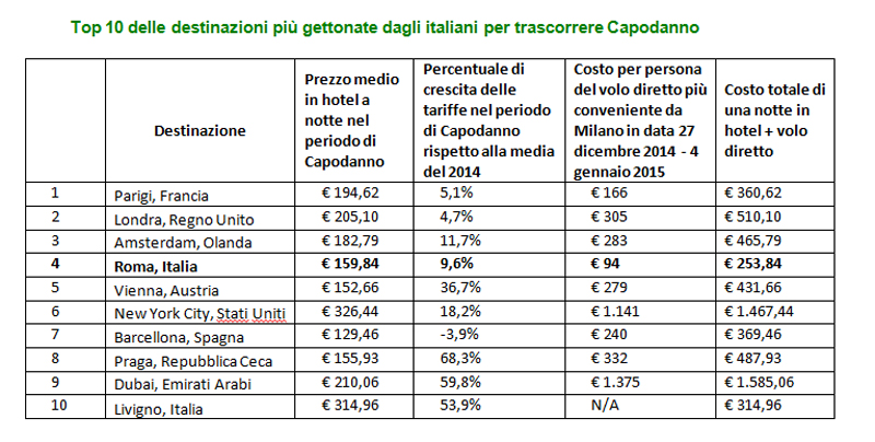 (3) Sulla base del costo medio a notte in hotel a tre e quattro stelle in ciascuna destinazione nel periodo di Capodanno compreso tra il 27 dicembre e il 4 gennaio